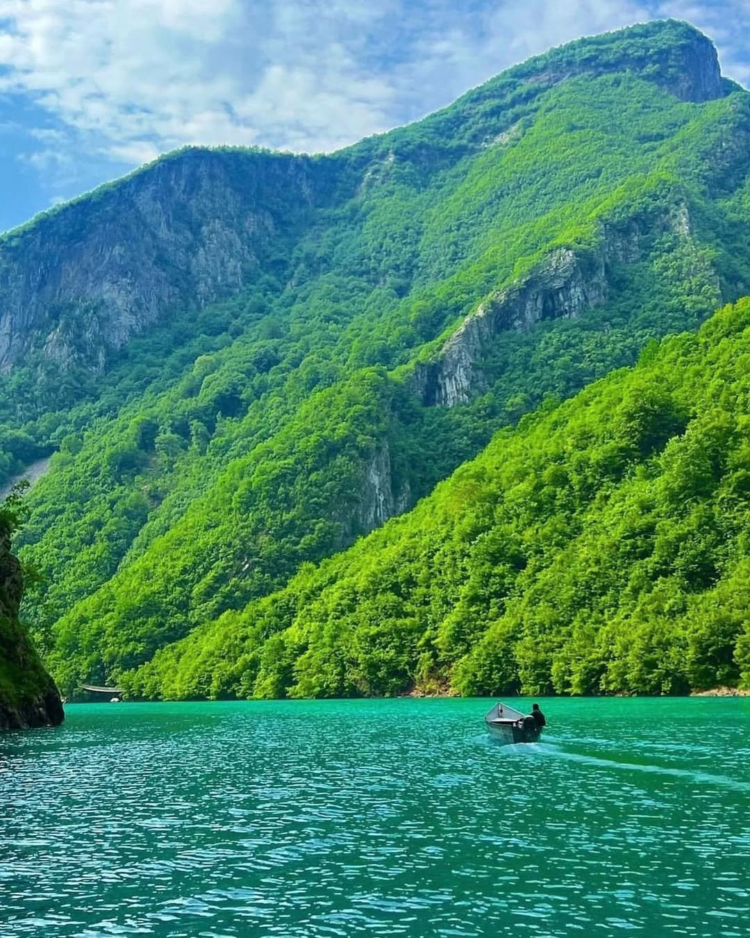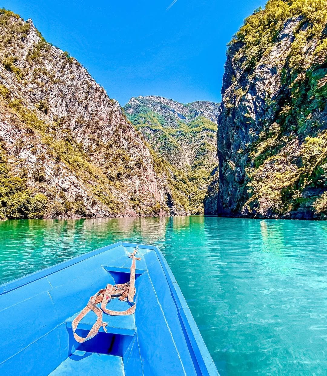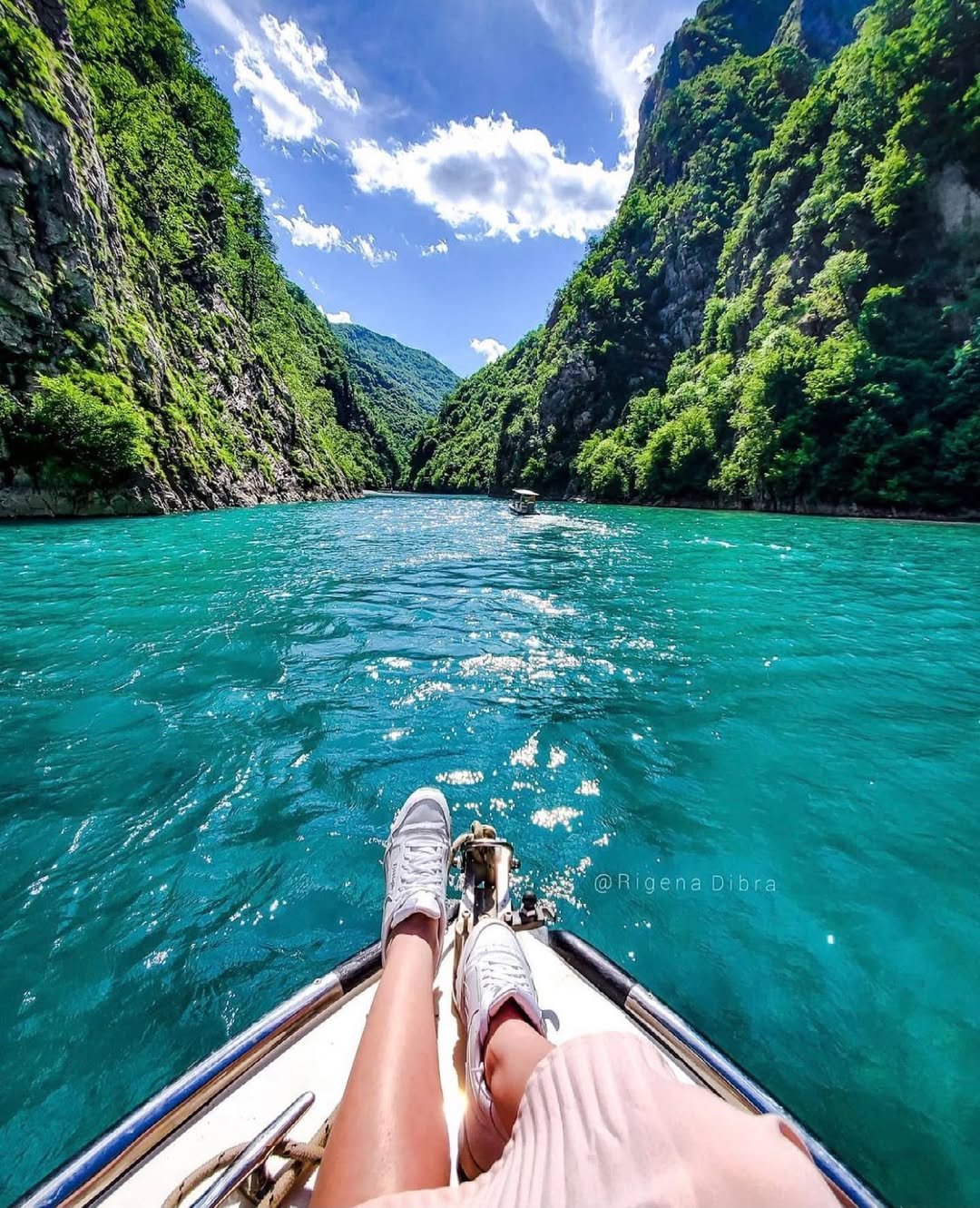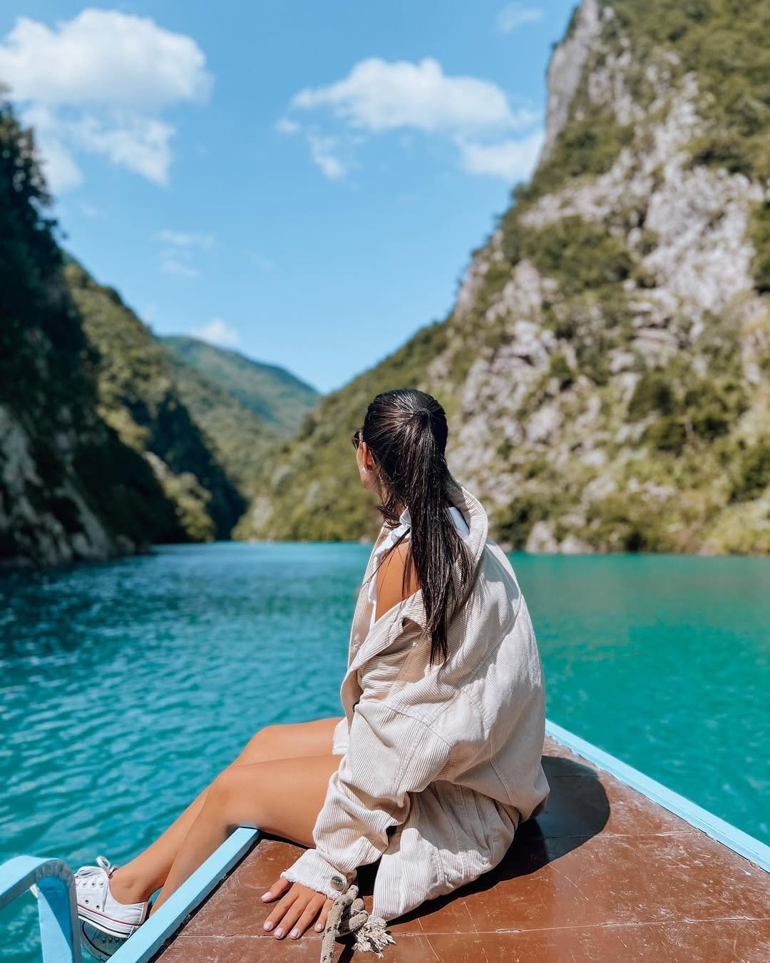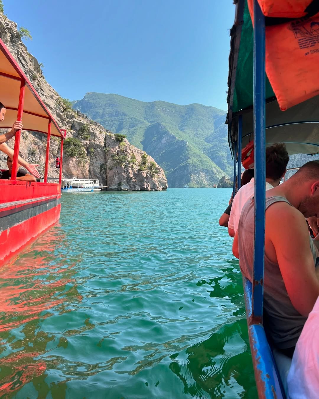 Scenic boat ride across the emerald waters of Komani Lake, surrounded by dramatic mountains and breathtaking landscapes.